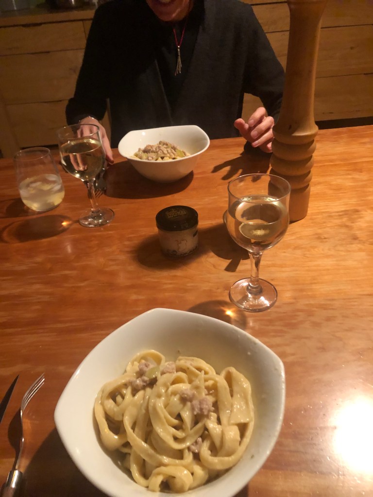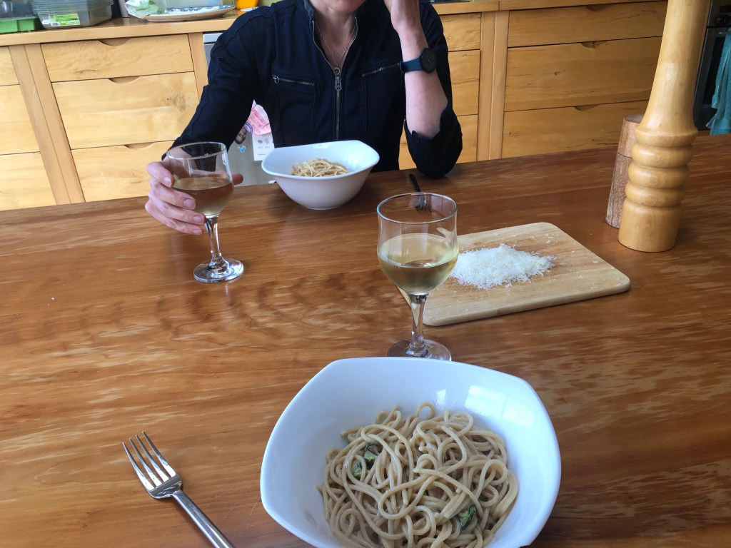It was time to talk to the pasta and see how he was doing. He was doing well, close to being ready to pop in a pot of boiling agua. (I didn’t tell him about the water, he was just relaxing there on the back of the chair and the chopping board and I didn’t want to harsh his buzz.) The advantage of fresh pasta, however, is that it needs way less time to cook than the packet stuff. So 25 minutes later, in went the tagliatelle mio (he just drifted off to sleep, peacefully) for about 4. You could leave it in for 5 or 6 if you don’t like plenty of al denty pasta with your meal. The result, if I say so myself, was non troppo male; pretty good.