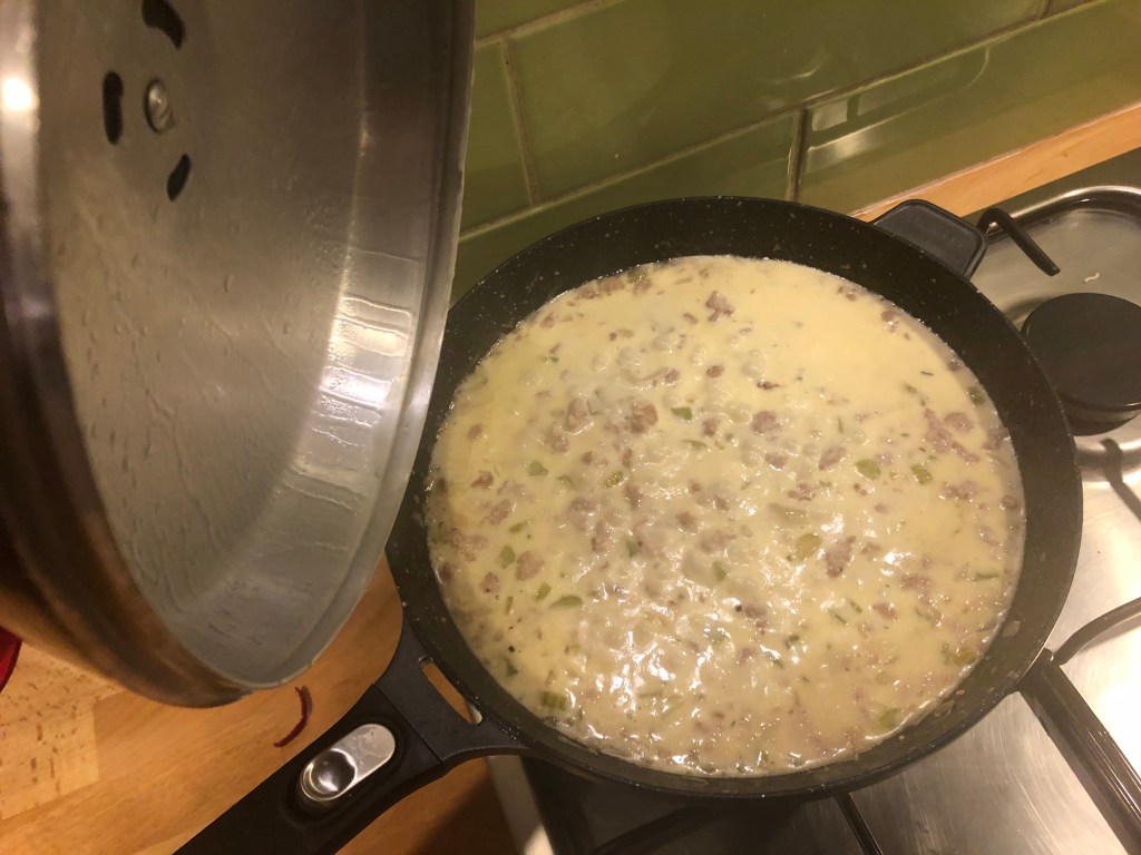 So I fried the rausage meat for about 10 minutes, threw in some onion, celery, rosemary, chilli and garlic (I ditched the fennel seeds that Rick uses; I like fennel, but its a strong flavour and I wanted to keep this a bit plainer to allow the sausies to dominate). At this point, I decided to taste the Italian pinot grigio bought for the recipe; it wouldn’t do to ruin a delicious meal by pouring the wrong wine into it. It passed the test over the course of the fifteen minutes that the veg and the pork were communing gently over a medium heat.