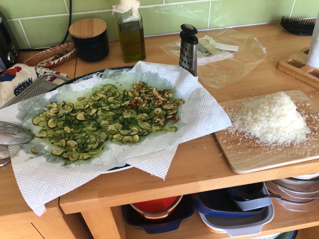 I followed Tucci’s instructions from Taste (genius Christmas present from my wife) which essentially commands you to slice 8-10 smaller, sweeter, zucchini, fry them until golden brown in sunflower oil, remove, drain, drizzle with chopped basil and salt, transfer to a bowl where you douse them in as much olive oil as you dare (be brave! she / he / they who dares, wins!).