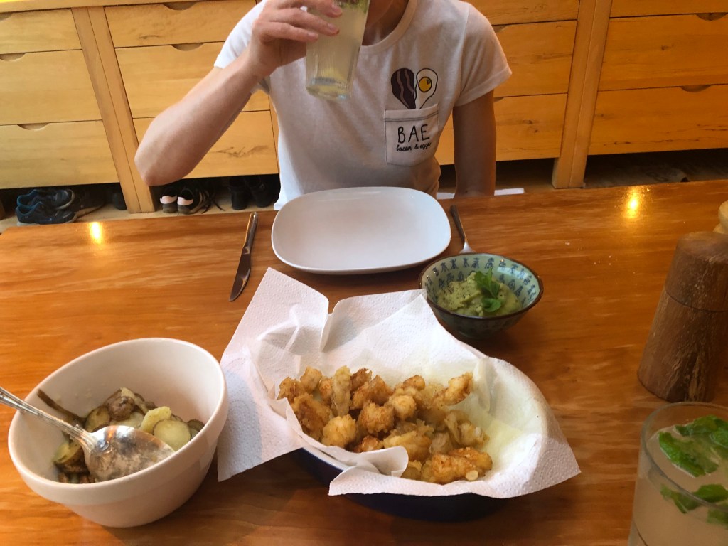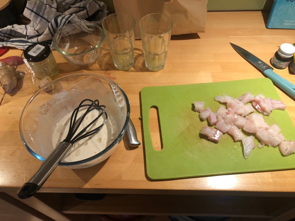 The previous attempt was taken from a book but this one is a tad different in that the batter is of the simplest tempura, rather than the, sometimes-too-much, breaded kind. You’ll find recipes for tempura all over the net, but I went the easy-peasy route: sparkling water, ice, plain flour, corn flour – mix. Before you do this, though, slice the haddock – 1 large fillet / 2 small ones should do you both – into bite-sized pieces. Before you do THIS, though, heat the oil. And before you even do THAT, heat a tablespoon of sunflower oil in an oven-proof dish and when suitably hot, chuck in your sliced new potatoes to roast for about 20 minutes. If you prefer to do things in the correct order, unlike me, follow these complicated instructions: