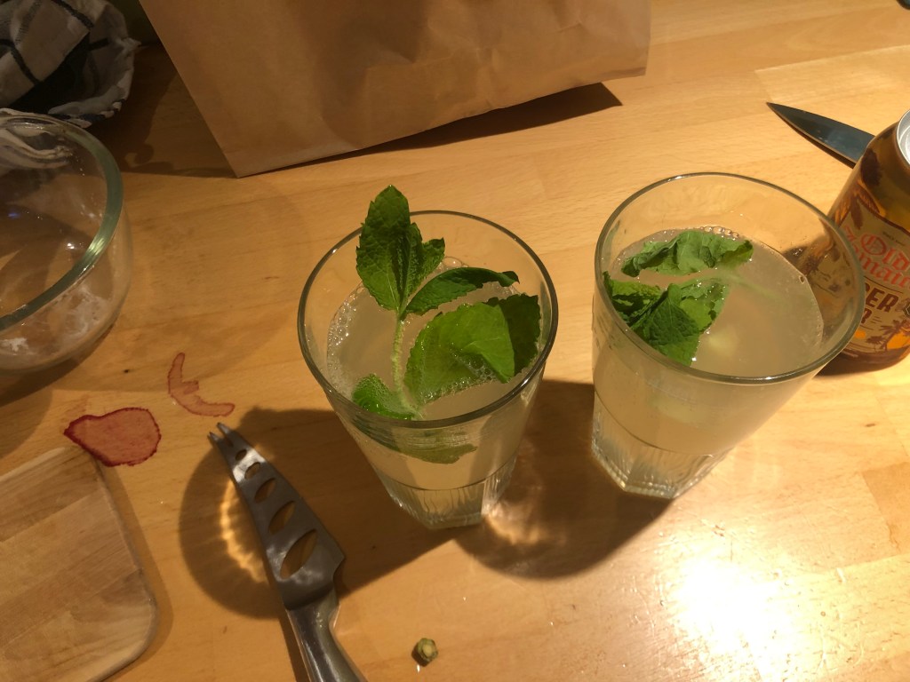 Chunk of root ginger, juice of half a lime, mint, (mashed with muddler) half-ginger beer, half sparkling water – forking delicious.