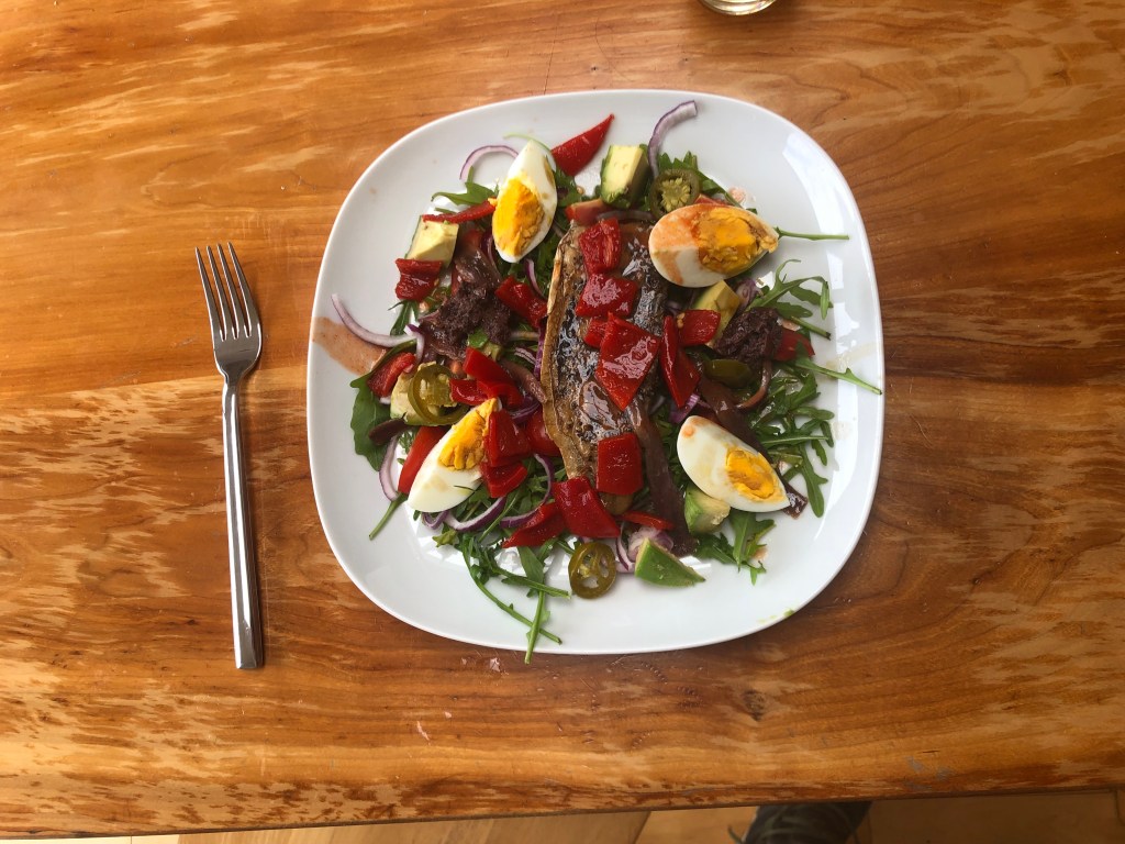 Peppered mackerel, anchovies, sunstream tomatoes, roasted red peppers, boiled egg, jalapeños, red onion, avocado, tapenade and Frank’s RedHot should generate enough fuel to get the rocket to the moon and back.