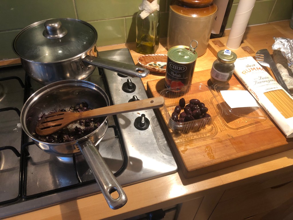 In this episode, I, The Wednesday Gourmet, creator-in-chief of Gourmet Wednesday (scroll down for what the heck all that means) shall attempt to cook the delectably sounding Lacot, which is what I call the dish that is made from Linguine, Anchovies, Capers, Olives and Tomato, but it sounds a bit more exotic than simply naming the ingredients. There’s garlic and parsley involved too but they’re quite basic ingredients and there was no room for them in the name; no-one is going to want to eat Catplog.
